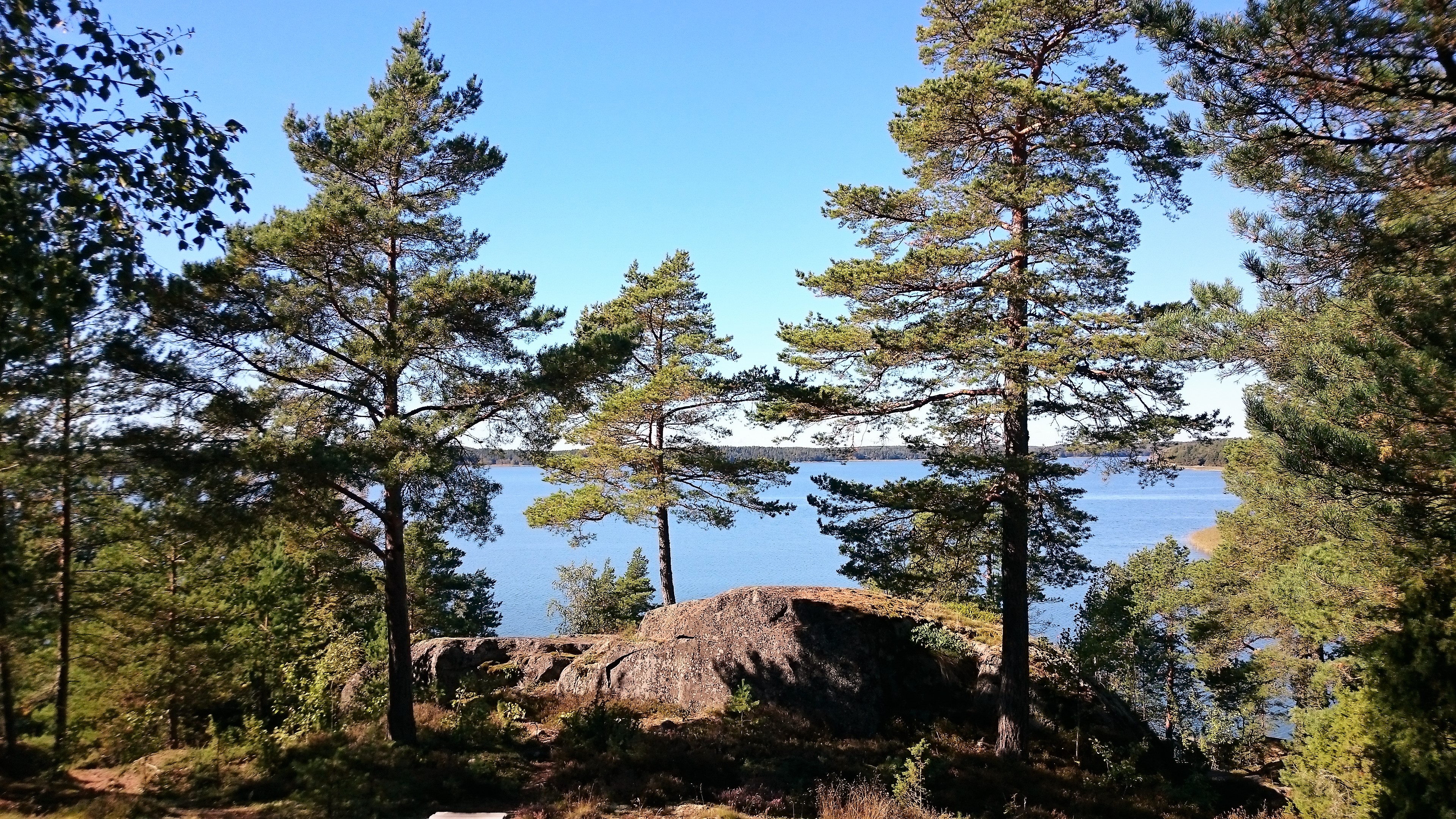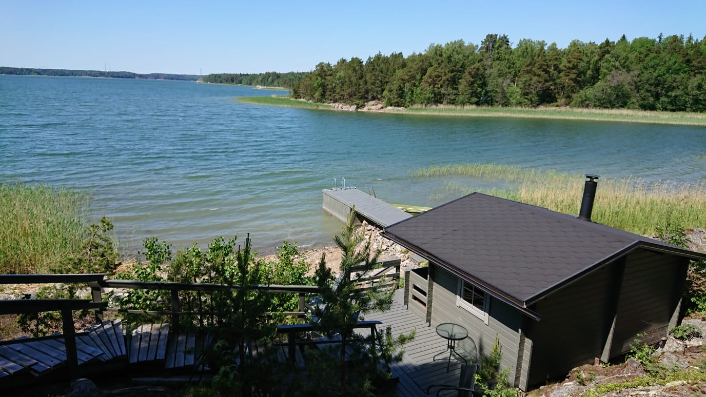 Mökki korkealla kalliolla, alhaalla rannassa pieni sauna.
